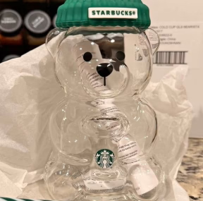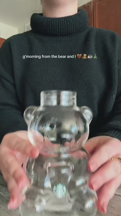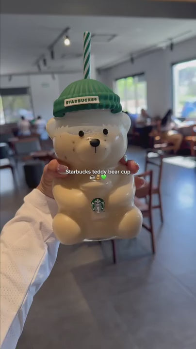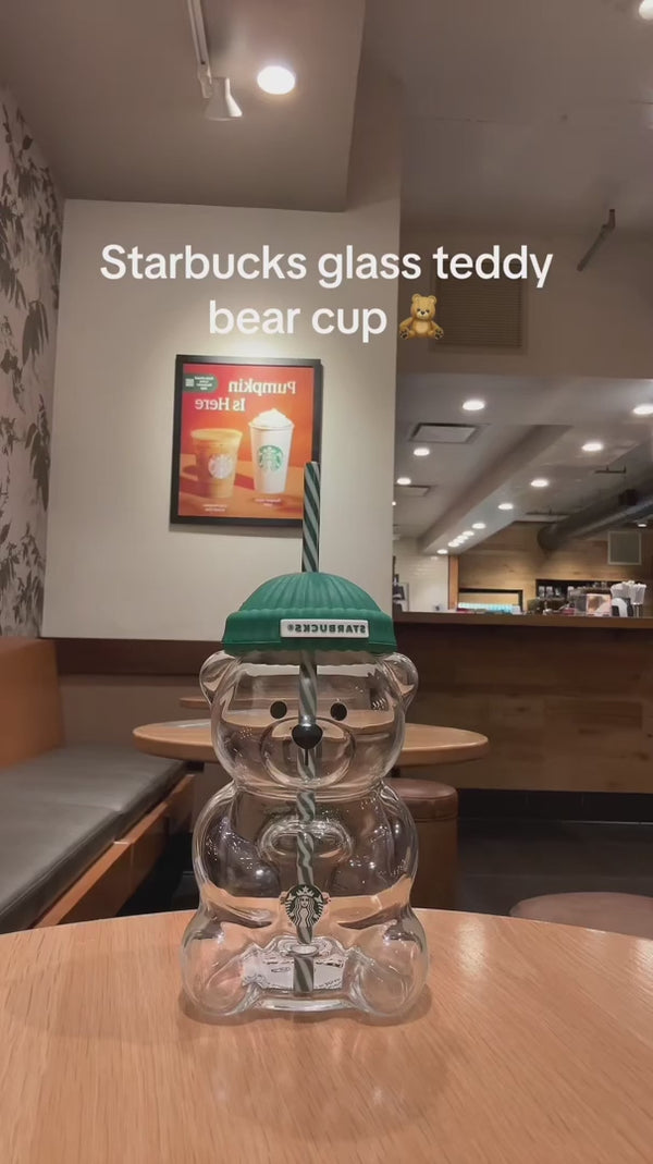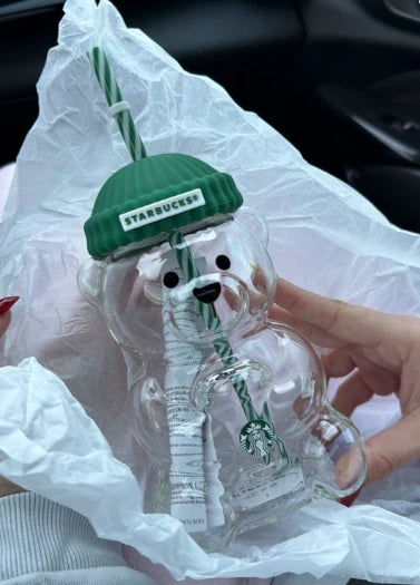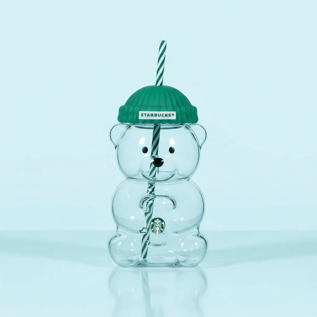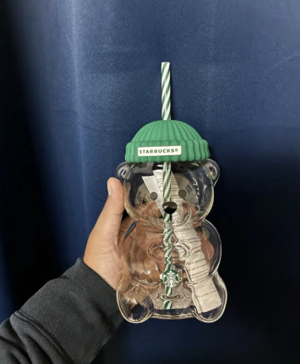 Sip in style with this adorable Starbucks Bear Glass Cup a clear glass teddy with a green beanie lid and striped straw for the cutest, coziest sips.